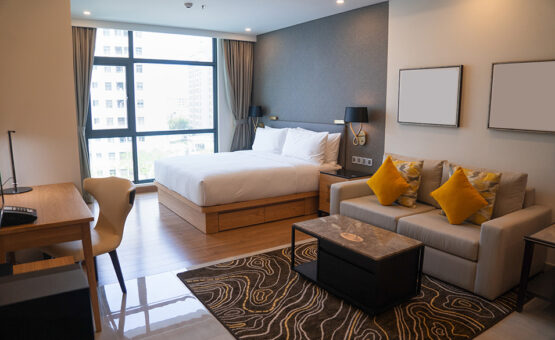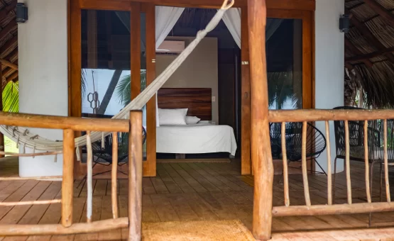 Bungalow para 2 personas con cama king size, aire acondicionado, cocineta, baño privado, hamaca y vista al mar.
